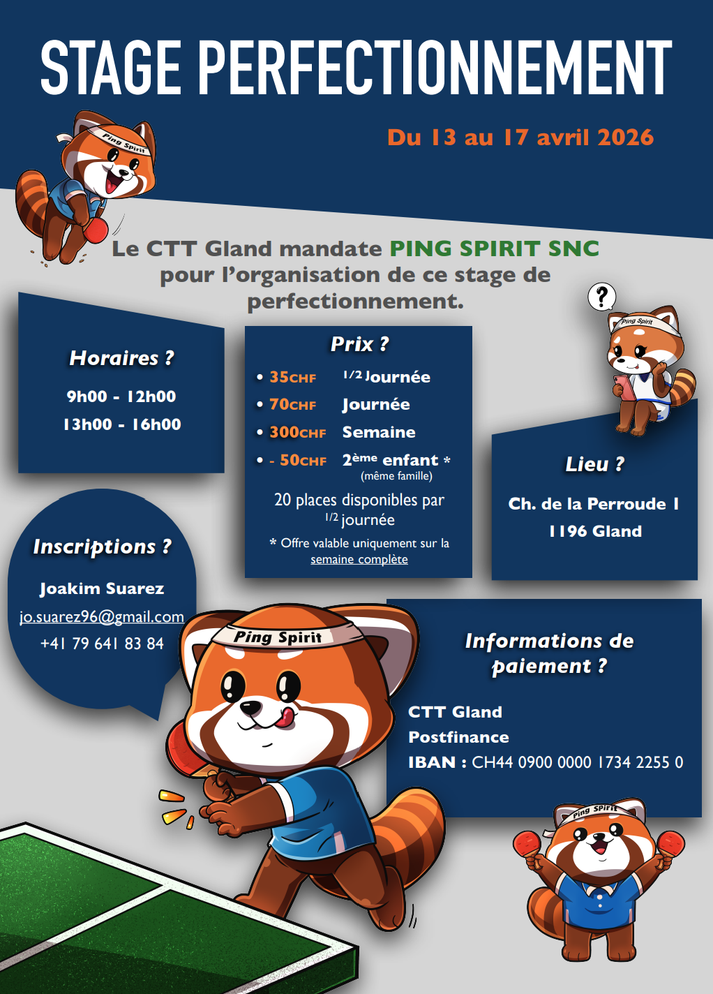 Le CTT Gland ouvre les inscriptions pour son stage de perfectionnement durant les vacances de Pâques, du 13 au 17 avril 2026. Ce stage est dédié aux enfants dès 8 ans et tous niveaux (Débutant à Série C-B)
